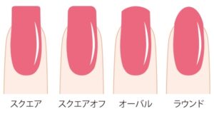 巻き爪を防ぐには、爪を短く切りすぎないことが大きなポイントです。爪の先端が指の先と同じくらいか、わずかに出ている程度がベストな長さとされています。そして角を深く切り込まず、まっすぐに切る「スクエアカット」(画像左から2番目の形)を心がけましょう。